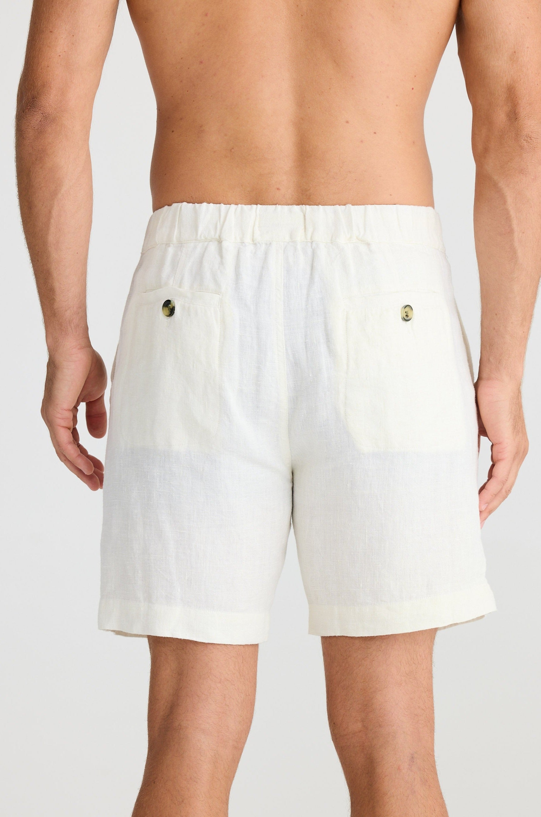 Cornell Short is crafted with a natural linen material, featuring an elasticated waistband with a drawstring tie. It also has a front fly opening and back welt pockets, as well as front cutaway pockets for added convenience.